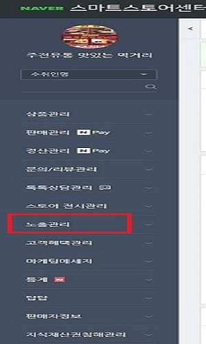 1. 스토어 홈 왼쪽 카테고리에서 노출 관리를 클릭합니다